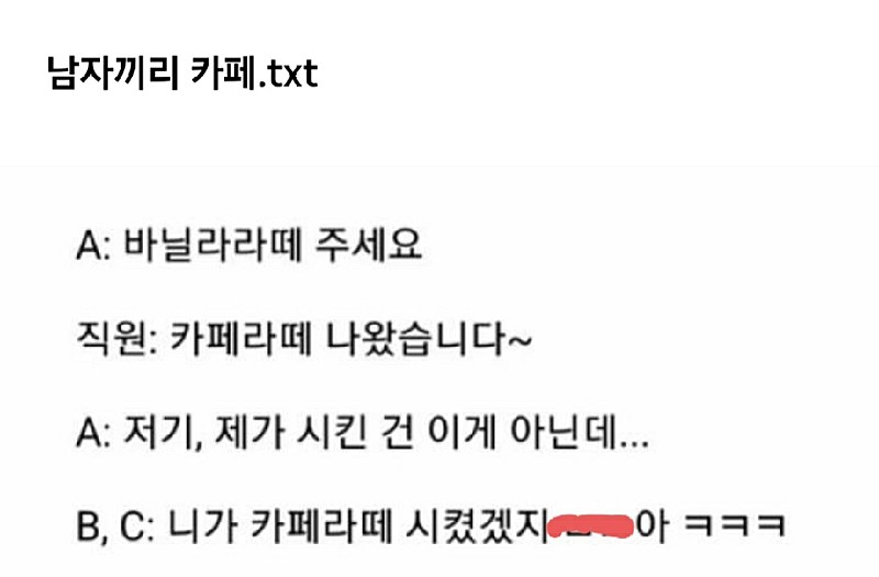 B,C : 니가 카페라떼 시켰겠지 ㅂ신아 ㅋㅋㅋㅋㅋ